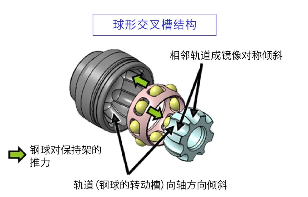 “CFJ”是一種固定式CVJ(等速萬(wàn)向節(jié)),它極大地改變了NTN傳統(tǒng)萬(wàn)向節(jié)的基本結(jié)構(gòu),并采用了NTN獨(dú)有的“球形交叉槽結(jié)構(gòu)*4”,該結(jié)構(gòu)可以抵消內(nèi)部組件所產(chǎn)生的力。
