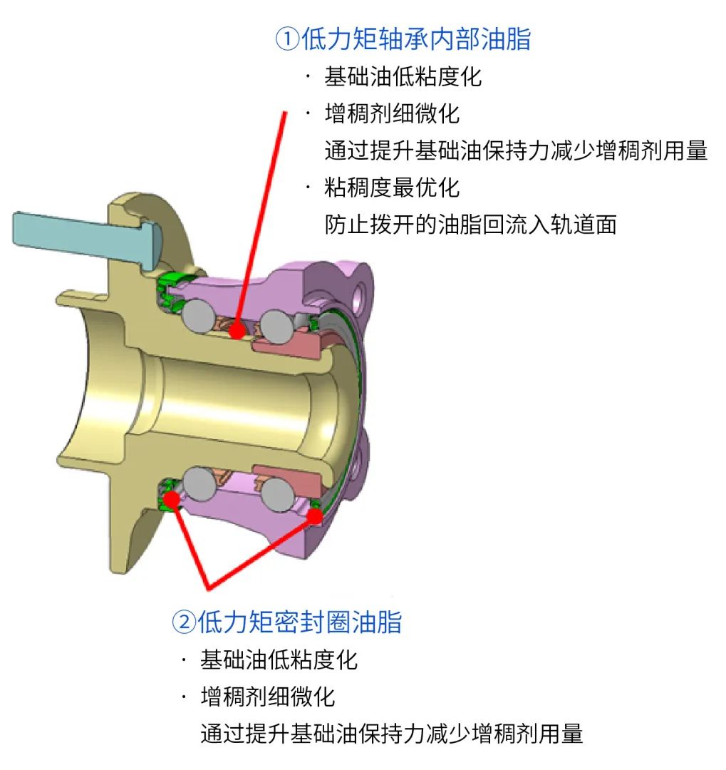 這款產品采用了專為外部密封圈和內部密封圈而開發的新型低力矩油脂。除了降低油脂的基礎油粘度外,還減小了增稠劑的尺寸,增稠劑的作用是保持基礎油并使其呈半固態。