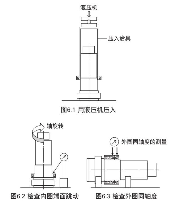 然后,在壓入內(nèi)圈時(shí),應(yīng)使用內(nèi)圈壓入工具,確實(shí)將其壓入軸肩(請勿向外圈加力)。壓入后,測量軸承各部位的精度,確認(rèn)是否確實(shí)安裝在軸上。另外,組配使用多列軸承時(shí),在組裝后應(yīng)測量其跳動(dòng),修正外圈間的軸心偏差。